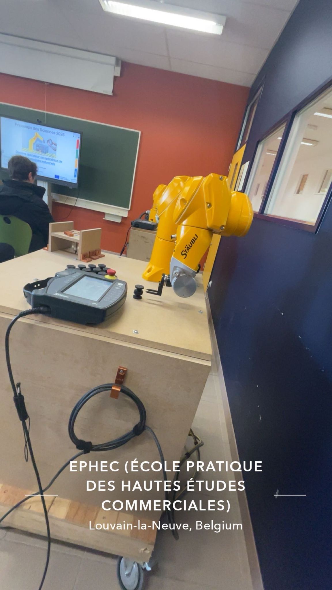 En mars 2025, j'ai été engagé comme jobiste à l'EPHEC dans le cadre du Printemps des Sciences, événement national de vulgarisation scientifique. Mon rôle était d'animer un atelier autour d'un bras robotisé industriel à destination de classes de 4e secondaire en visite sur le campus. Cette mission combinait technicité (manipuler un équipement industriel) et pédagogie (transmettre à un public non-initié, jeune et hétérogène).